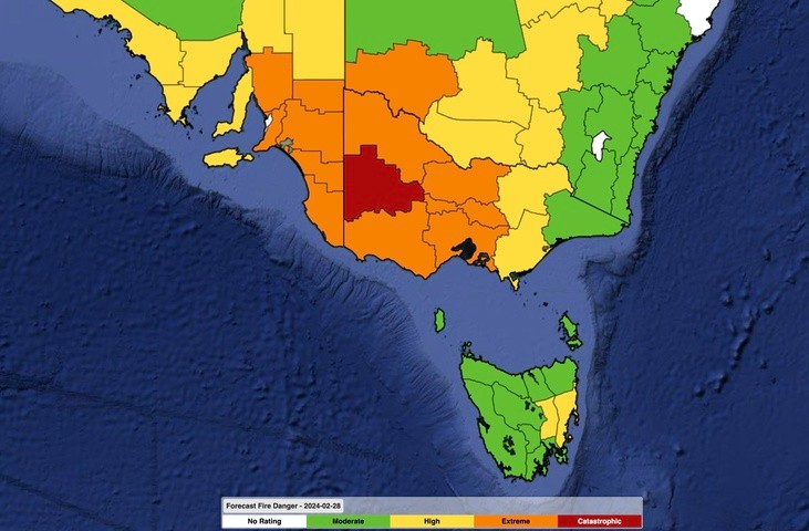 Image: Forecast fire danger ratings on Wednesday, February 28, 2024.