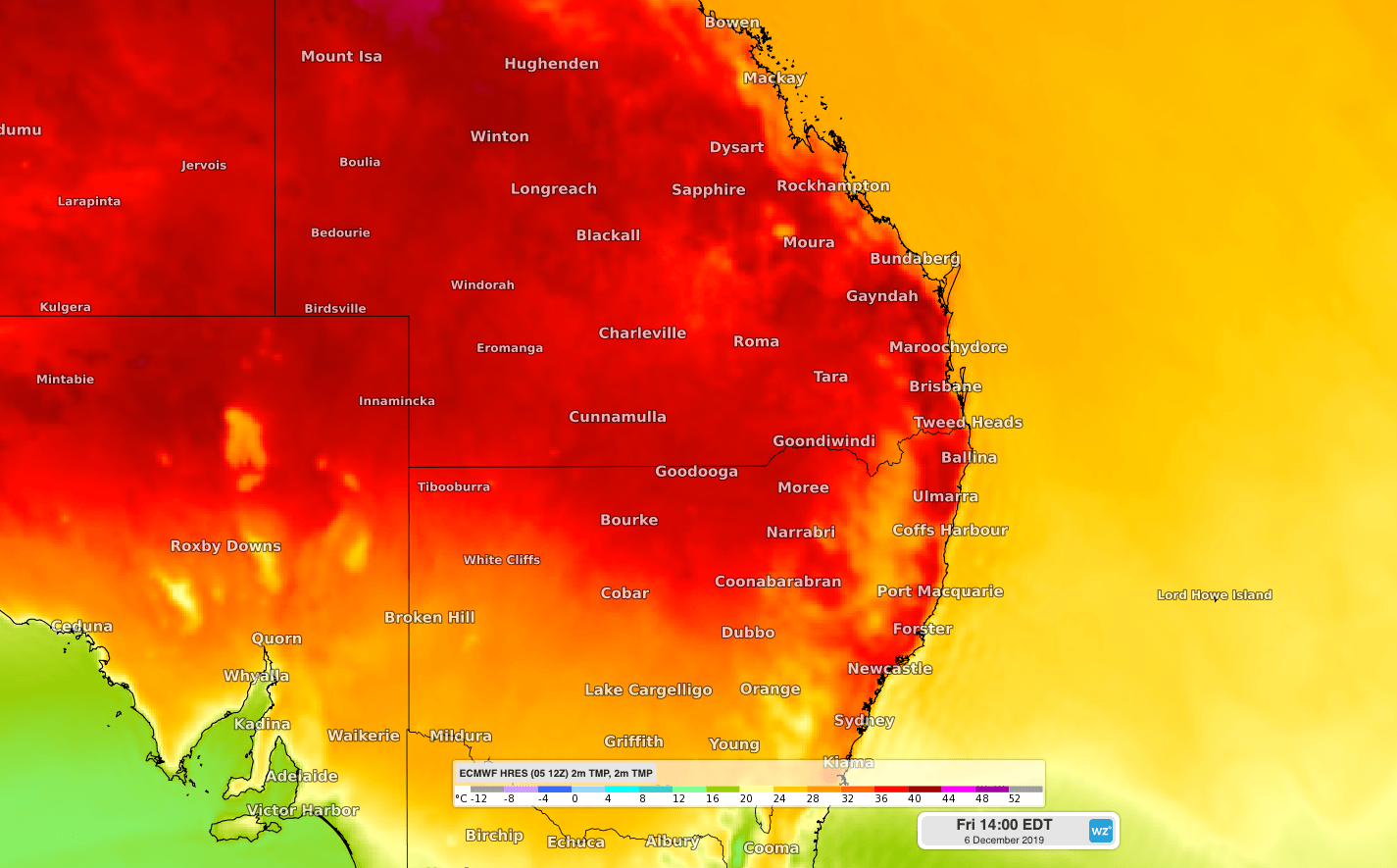 Image: Modelled surface temperature showing hot air over southeast Queensland and other areas of eastern Australia on Friday, December 6th.
