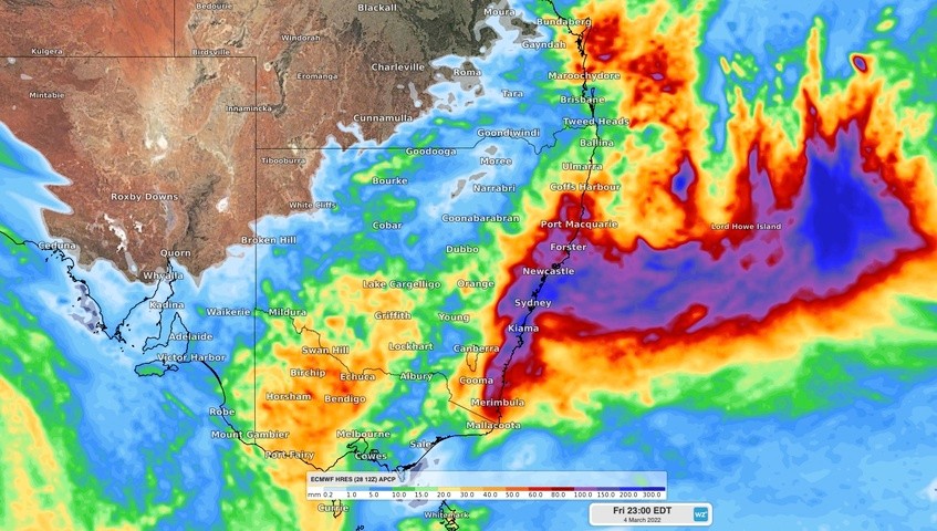 The animation below shows the predicted movement of this developing East Coast Low, and its associated rainfall, according to Australia's ACCESS-G forecast model.