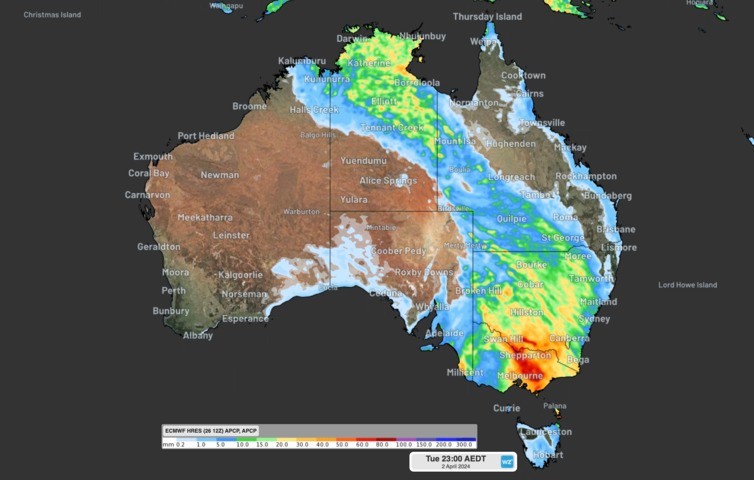 Image: Accumulated rainfall for the 24 hours leading up to 11pm on Tuesday, April 2, according to ECMWF