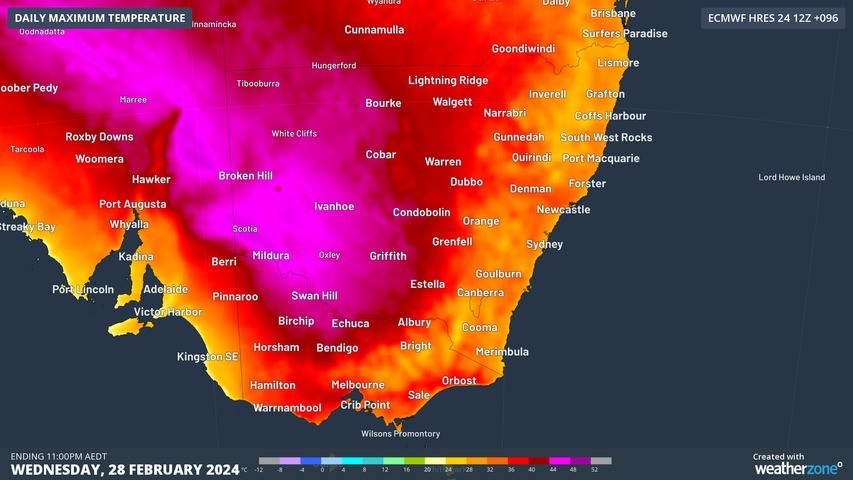 Modelled daily maximum temperatures on Wednesday 28th February over southeastern Australia.