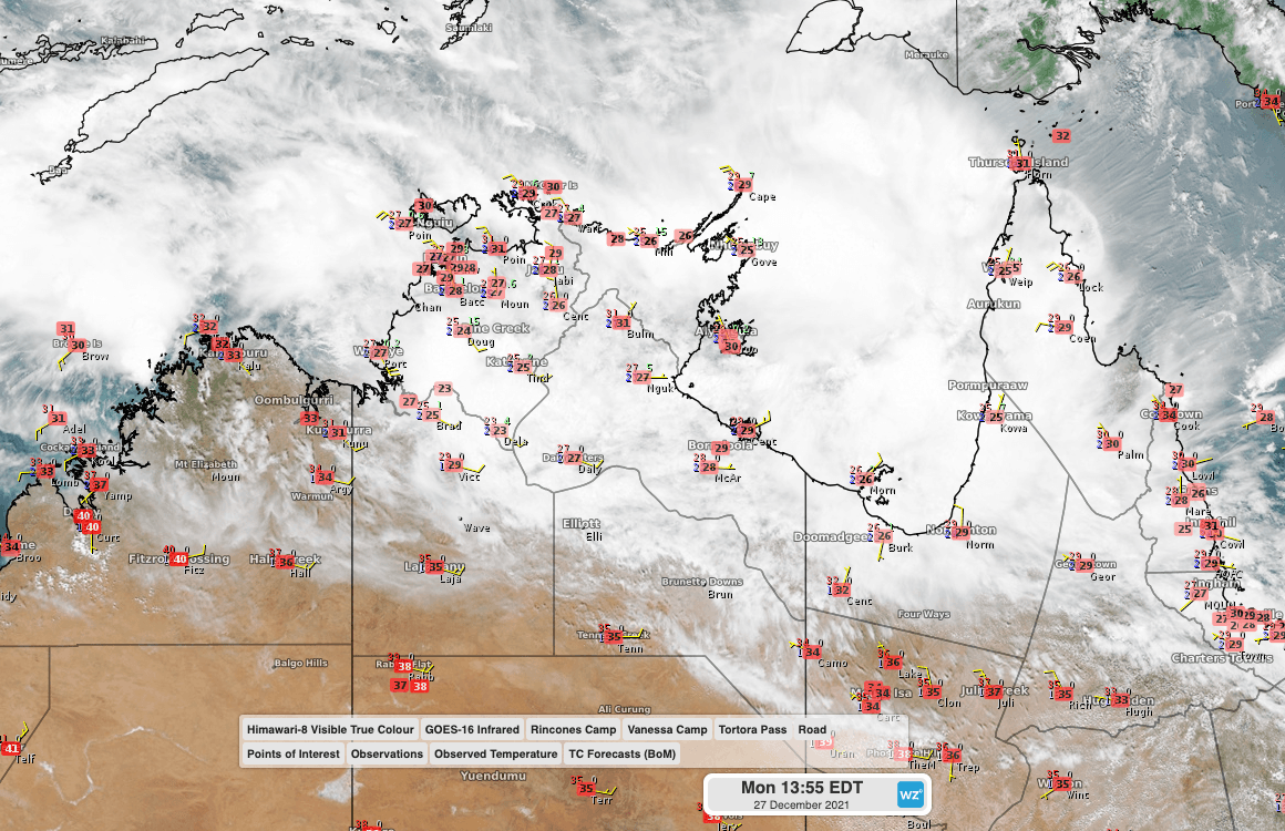 Further north, a deepening tropical low to the west of Darwin was making for a particularly wet, cool and cloudy Christmas Day. The thick cloud cover and frequent heavy showers led to the coldest Christmas Day in Darwin on record, with a maximum of 27.3°C reached.