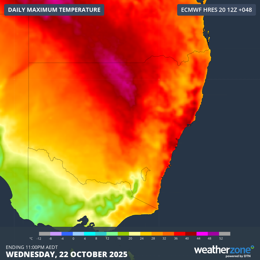 The tongue of intense heat sweeping over NSW on Wednesday will see temperatures climb more than 15°C above average for this time of year in the state’s east, with October records likely to be challenged.