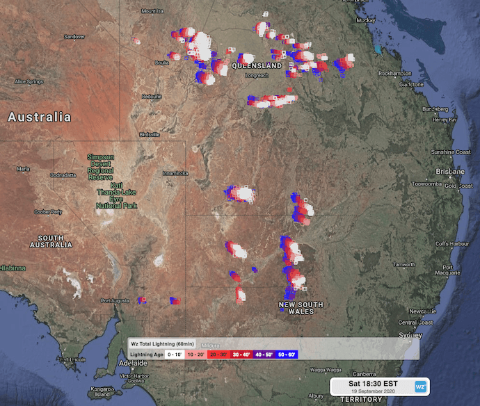 More than 650,000 lightning strikes were registered within 500km of Middleton (Qld) from Saturday midnight to Sunday 9am, with over 75,000 hitting the ground. Further south, in a radius of 500km centred in Bourke (NSW), the Weatherzone lightning network detected more than 130,000 strikes, with just under 20,000 ground strikes, within the same period of time.