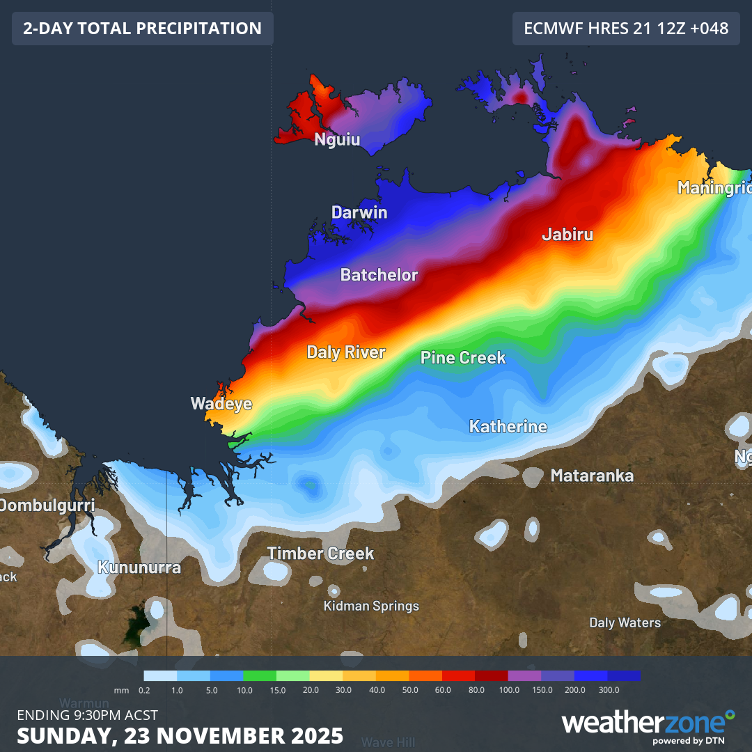 Rainfall rates in the Darwin region could reach 100 to 300mm in 24 hours by Sunday morning, with isolated falls possibly reaching around 500 mm over parts of the northwest Top End.