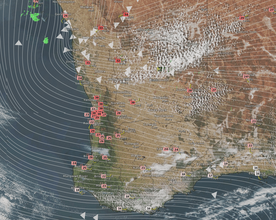 Image: Himawari-8 Satellite imagery with overlaid temperature observations and modelled wind field at 2:30pm AWT showing easterly winds feeding into a coastal trough leading to temperatures in the high-20s and low-30s across much of the west.
