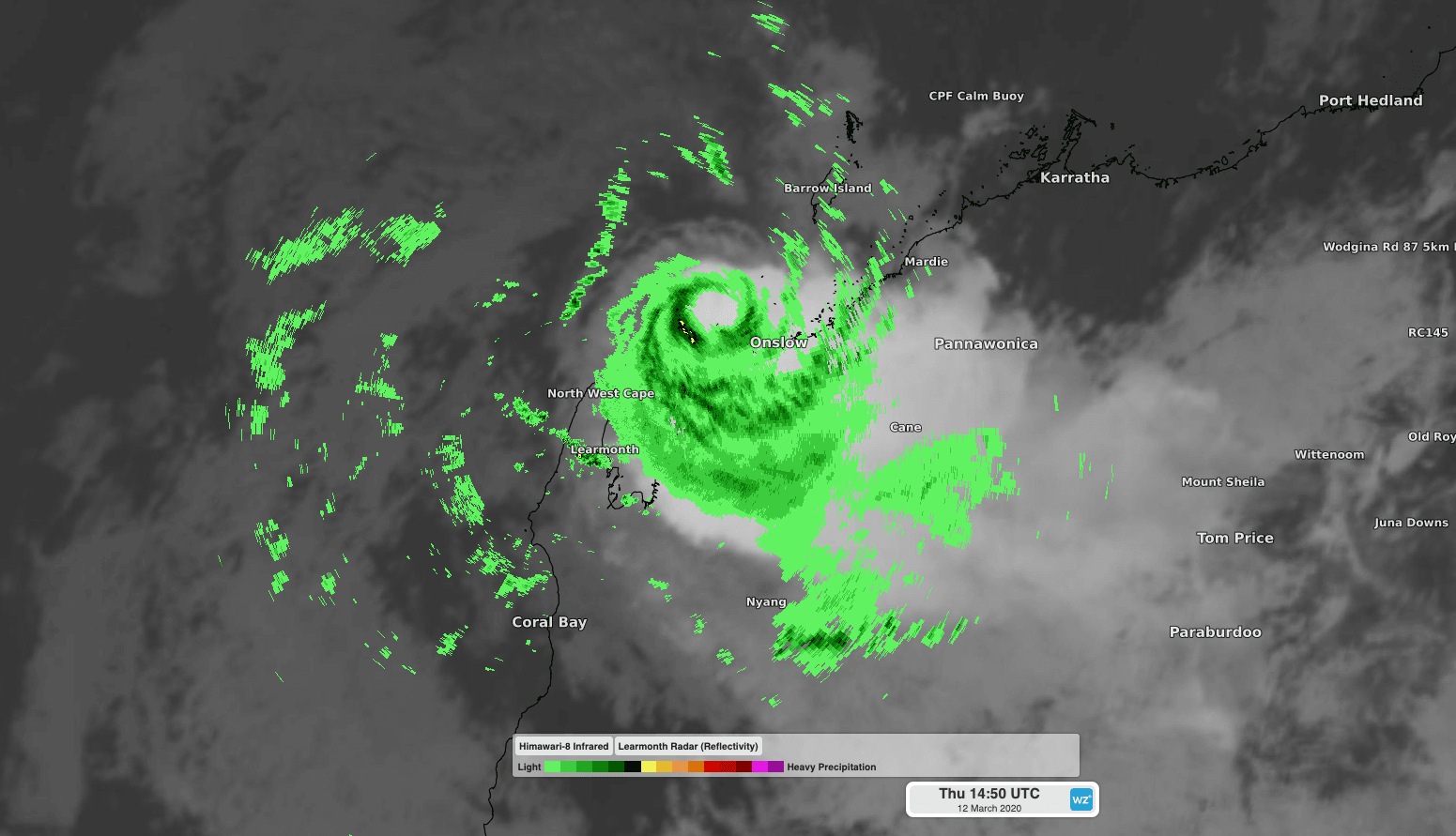 Image: Composite infrared satellite and radar image showing a tropical low crossing the northwest Pilbara coast on Thursday night.