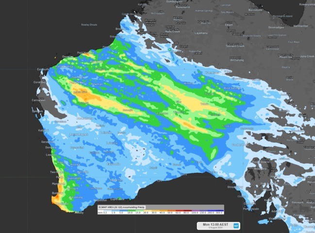 Image: Accumulated 5- day rain forecast leading up to 11am AWST on Monday, August 5, according to ECMWF.