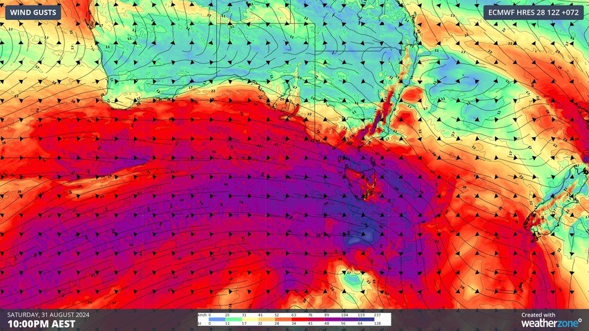 Image: Forecast wind gust speed and direction on Saturday night, according to the ECMWF-HRES model.