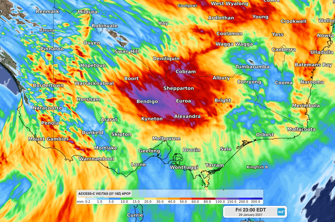 Widespread falls of 20-40 mm are likely in central, western, and northeastern Victoria during Friday and into Saturday morning. Some places could pick up more than 50mm and a few models even suggest that isolated totals over 100mm will be on the cards.