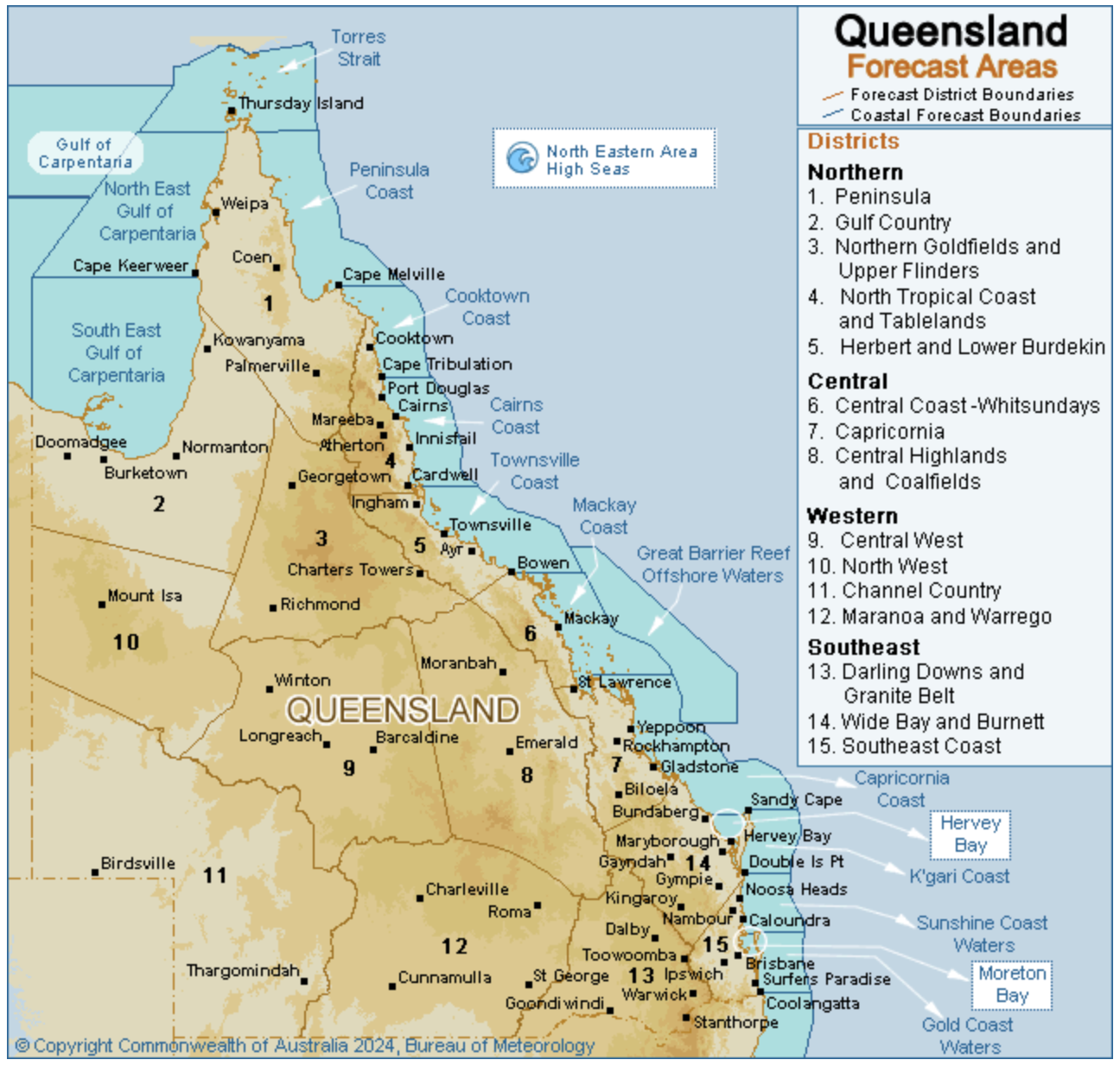 Image: Forecast district map of Qld. The Gulf Country, North West, Central West, Northern Goldfields and Upper Flinders, North Tropical Coast and Tablelands, and Herbert and Lower Burdekin will be the wettest areas in the coming few days. Source: Bureau of Meteorology.