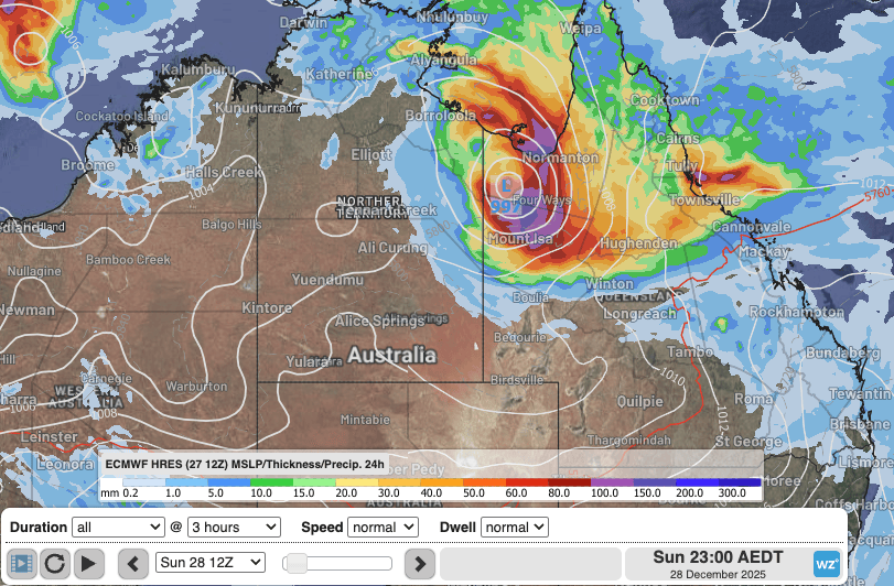 Rainfall totals over the coming days are likely to be even higher with daily falls of 200-300mm expected over some areas. The wettest period, for both northwest and northeast Qld, looks like Sunday into Tuesday night. By the end of the month, some locations could accumulate nearly half a metre of rain, bringing December totals to well above average. There'll be an easing trend later in the week before another trough moving in from the west enhances rainfall again around the weekend before finally sending a drier change over most of Qld next week.