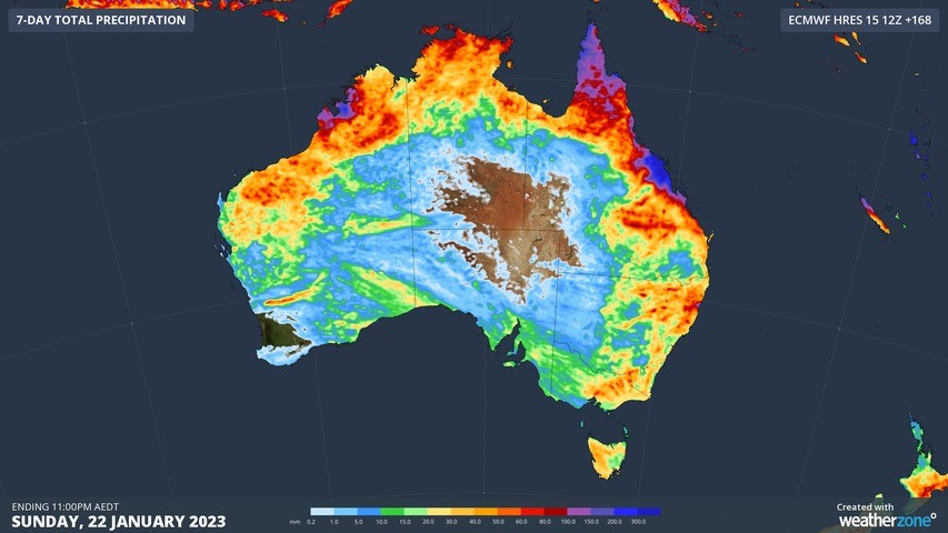 Image: Forecast accumulated precipitation during the 7 days ending at 11pm AEDT on Sunday, January 22, 2023.