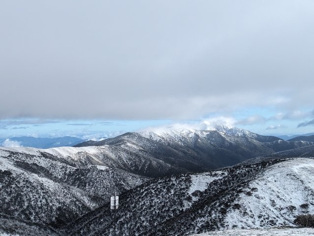 As for the unseasonable spring snow, this was the view of Mt Feathertop from the Great Alpine Rd at Mt Hotham on Thursday morning as cold air behind the front combined arrived in time to combine with the last few hours of available moisture.