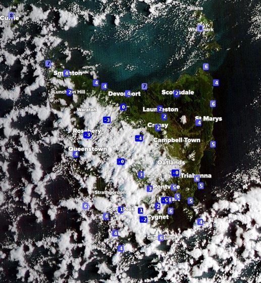 Image: Satellite (Himawari-8) imagery with observed temperatures showing cold morning in TAS at 7am EST