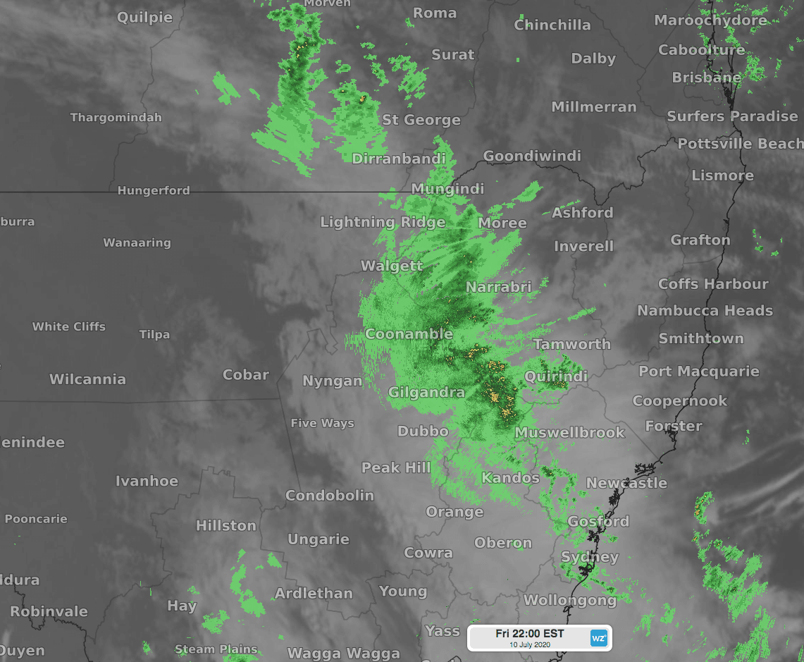 Image: rain falling over western parts of Queensland and NSW on Friday night.