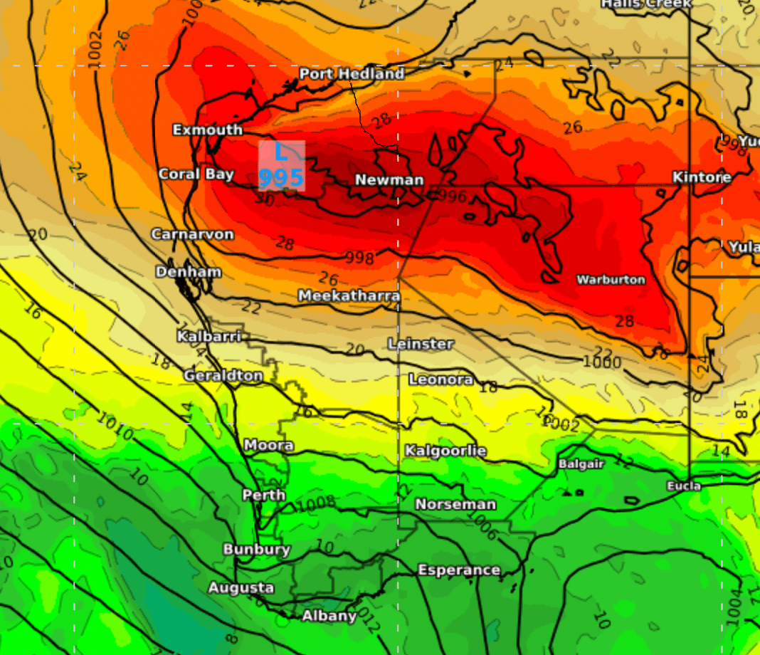 ECMWF Model: Tuesday 25th at 1400 WST. A weak cold front sweeping across WA’s southwest, helping drop the temperatures.