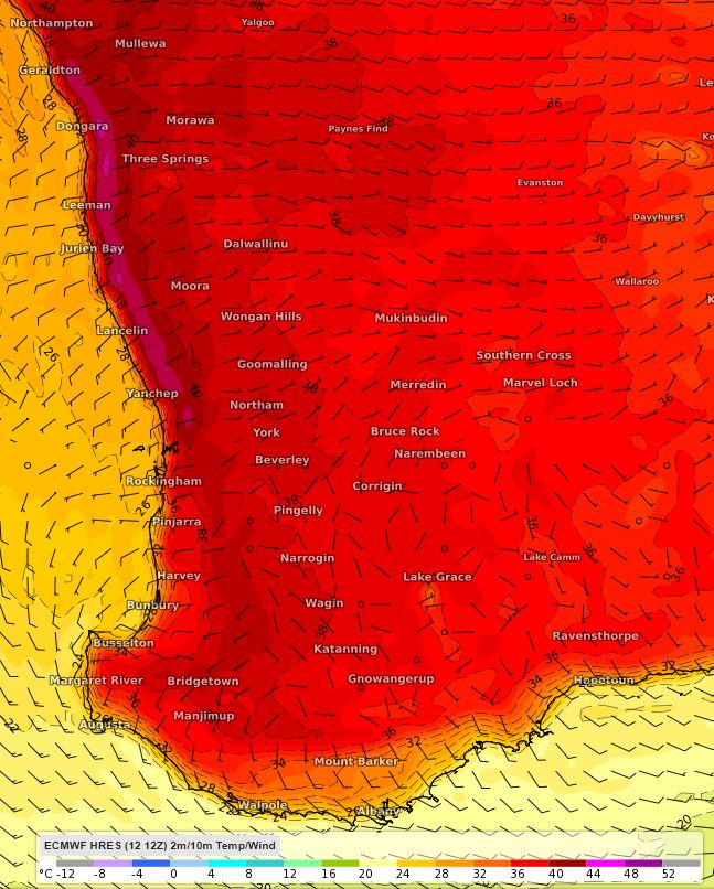 In the next week, maximum temperatures are expected to peak in the high thirties and low forties (mostly seven to nine degrees above the monthly average) across large parts of the southwest. Along the coast of the Central West district in Geraldton, temperatures are set to pass 40 degrees for a least two days, most likely on Wednesday and Thursday. This bout of heat is not likely to be as intense as the previous spell earlier in February when it reached 44.7 degrees.
