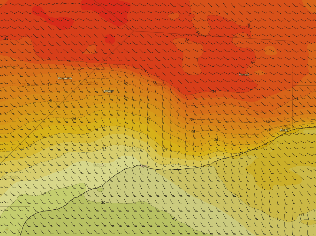 Eucla, in the far southeast of WA, reached a sweltering maximum of 38 degrees just before midday. However, since then, a burst of southeasterly winds has cooled Eucla so the mercury is sitting around 33 degrees. As evening descends, the temperature should drop even further with these cooling winds, with the forecast minimum at 16 degrees. Then a couple of below 30 degree days will follow.