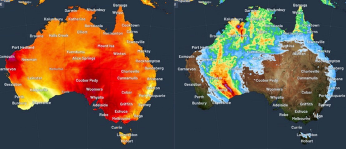 A developing monsoon trough in the northern tropics, along with a dynamic interplay between a trough and front, combined with abundant tropical moisture in WA’s southeast (Fig.1), heightens flood concerns. This is especially notable in WA’s southeast, where rainfall has been scarce for extended periods in recent months and even years. Meanwhile, southeast Australia is experiencing a starkly different situation, with a heatwave and dangerous fire conditions in SA and Vic (Fig. 2), fuelled by hot northerly winds.