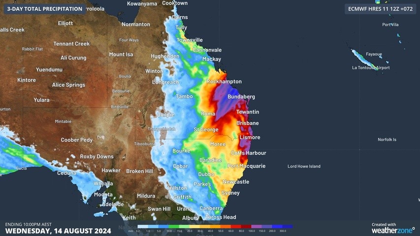 Image: Forecast accumulated rain during the 72 hours ending at 10pm AEST on Wednesday, August 14, 2024, according to the ECMWF-HRES model.