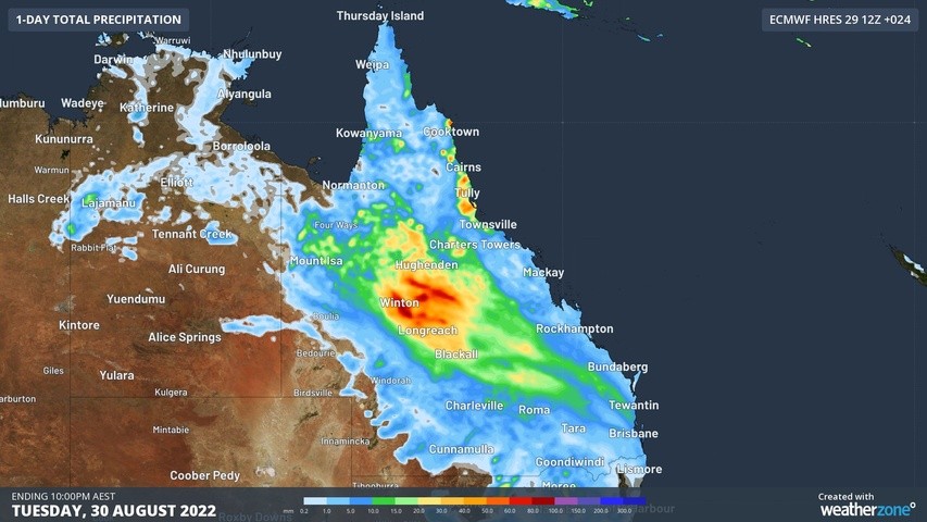Image: Forecast accumulated rain during the 24 hours ending at 10pm AEST on Tuesday, August 30, 2022.