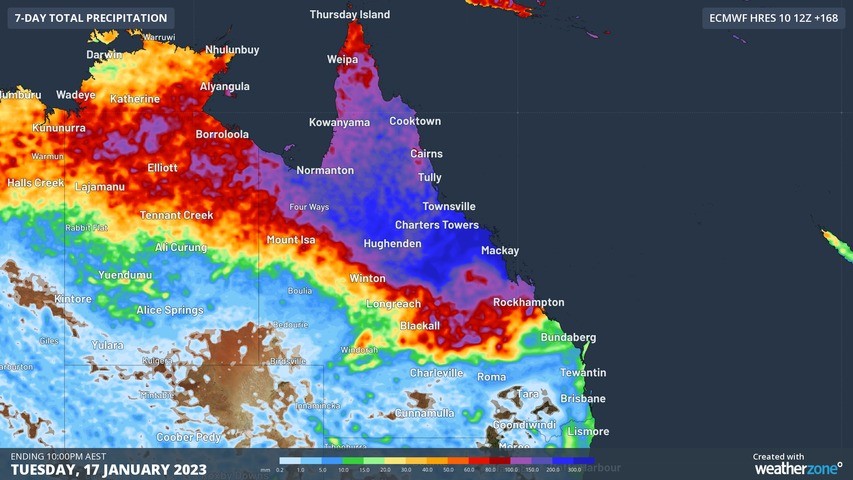 The chart below shows the predicted rainfall over the next week. As you can see, the heaviest falls (in dark blue) are expected between about Mackay and Townsville, and there is some indication that the area could see an extreme rainfall event with as much as 700 mm of rain.