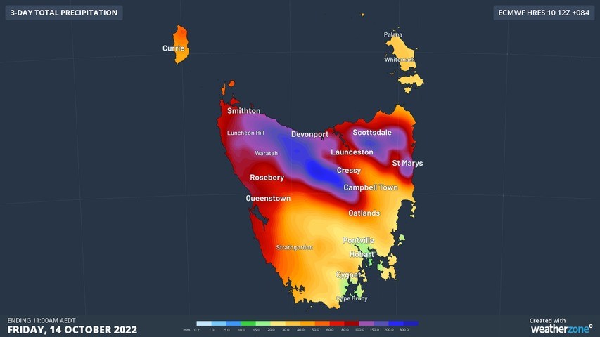 A number of forecast models suggest that accumulated falls of 150 to 250 mm are possible in northern Tasmania between Wednesday and Friday, most of which will hit the ground on Wednesday night and Thursday. This rain is likely to cause flooding.