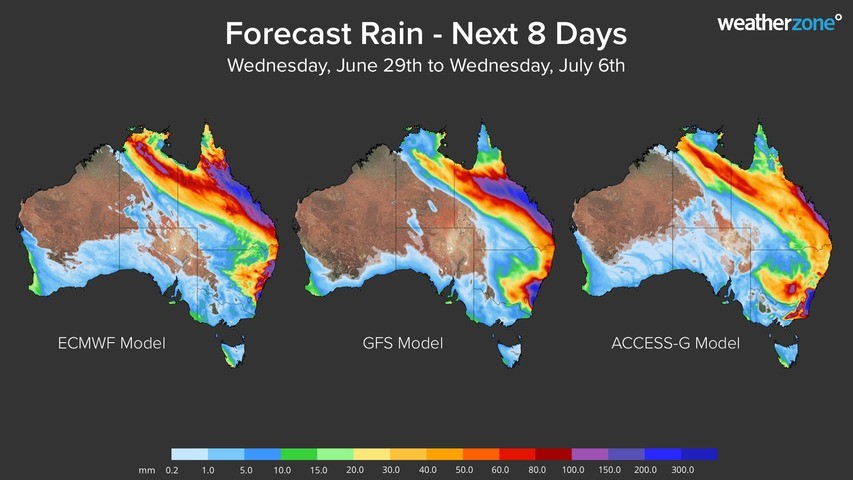 Most forecast models suggest that rain will continue to affect some eastern parts of NSW and QLD on Tuesday and Wednesday. However, the model uncertainty this far ahead makes rainfall predictions hard to pin down.