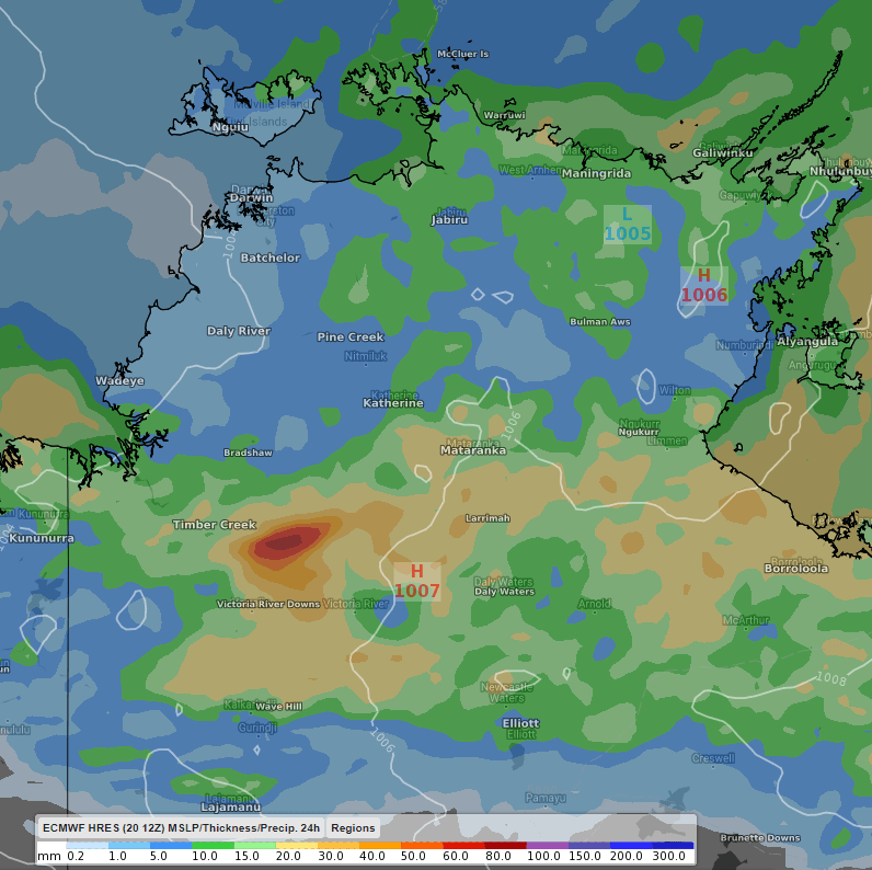 Well over 100 mm may fall over the next week for the Daly, including Darwin. Widespread thunderstorm activity is also likely to be a daily occurrence, with the potential for heavy rain and damaging winds a risk with any storms later today and tomorrow.