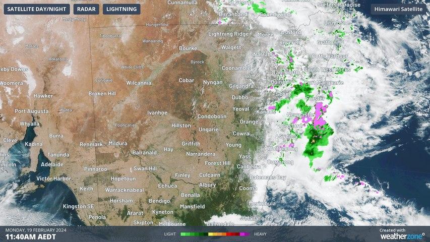 Video: Composite satellite, radar and lightning showing thunderstorms over eastern NSW on Monday morning.