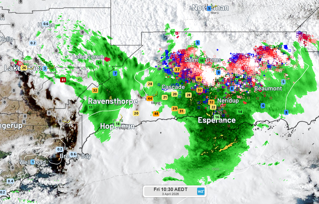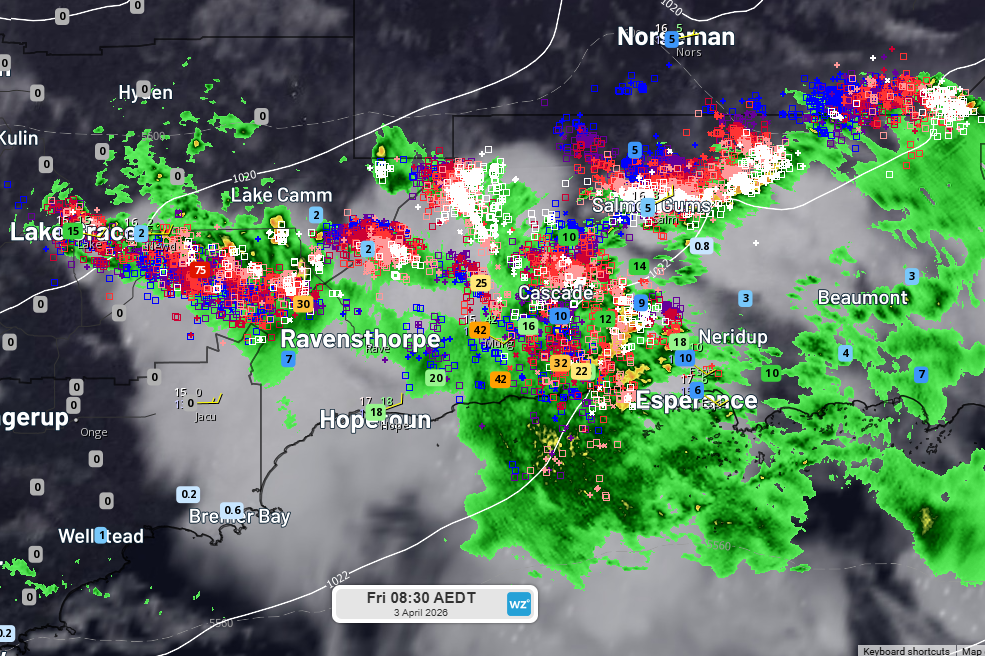 After sunrise, the most intense thunderstorms had shifted east of Salmon Gums area by 7:30am WST.