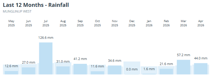 Image: Monthly rainfall observations compared to averages for Munglinup West. Source: Weatherzone.