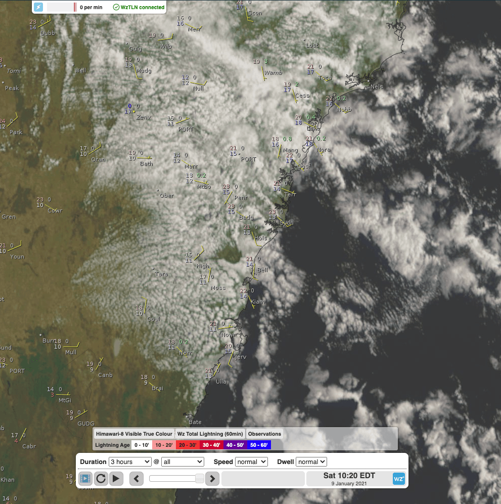 Satellite image showing the last lingering bit of cloud over Sydney, which should clear north over the remainder of the day, giving way to a sunny remainder of the weekend, and start of the working week.