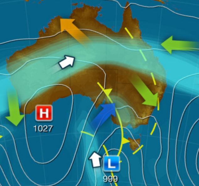 It's all thanks to a cold front which moved through Adelaide this morning and is which is now steadily tracking east, as you can clearly see on the synoptic chart below.