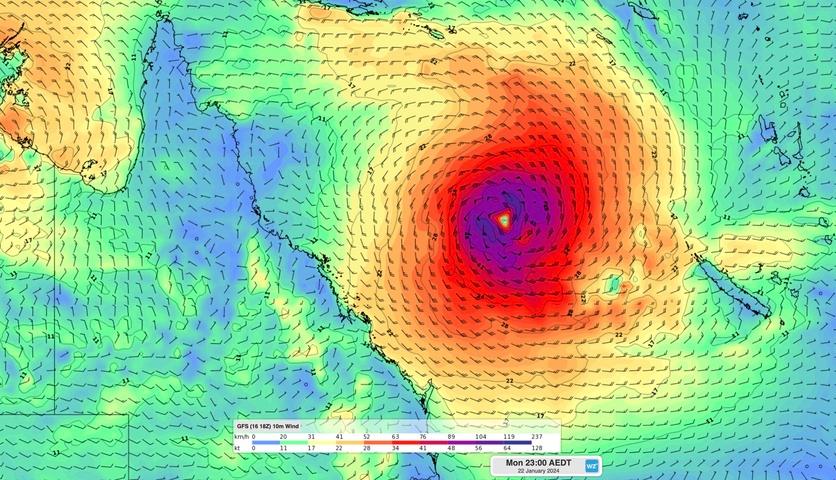 Image: The Bureau of Meteorology’s tropical cyclone outlook for the Coral Sea on Wednesday, January 24, 2024. Forecast valid at 3pm AEST on January 17, 2024. The dark shading highlights areas that lie outside Australia’s area of responsibility for tropical cyclone monitoring. Source: Bureau of Meteorology
