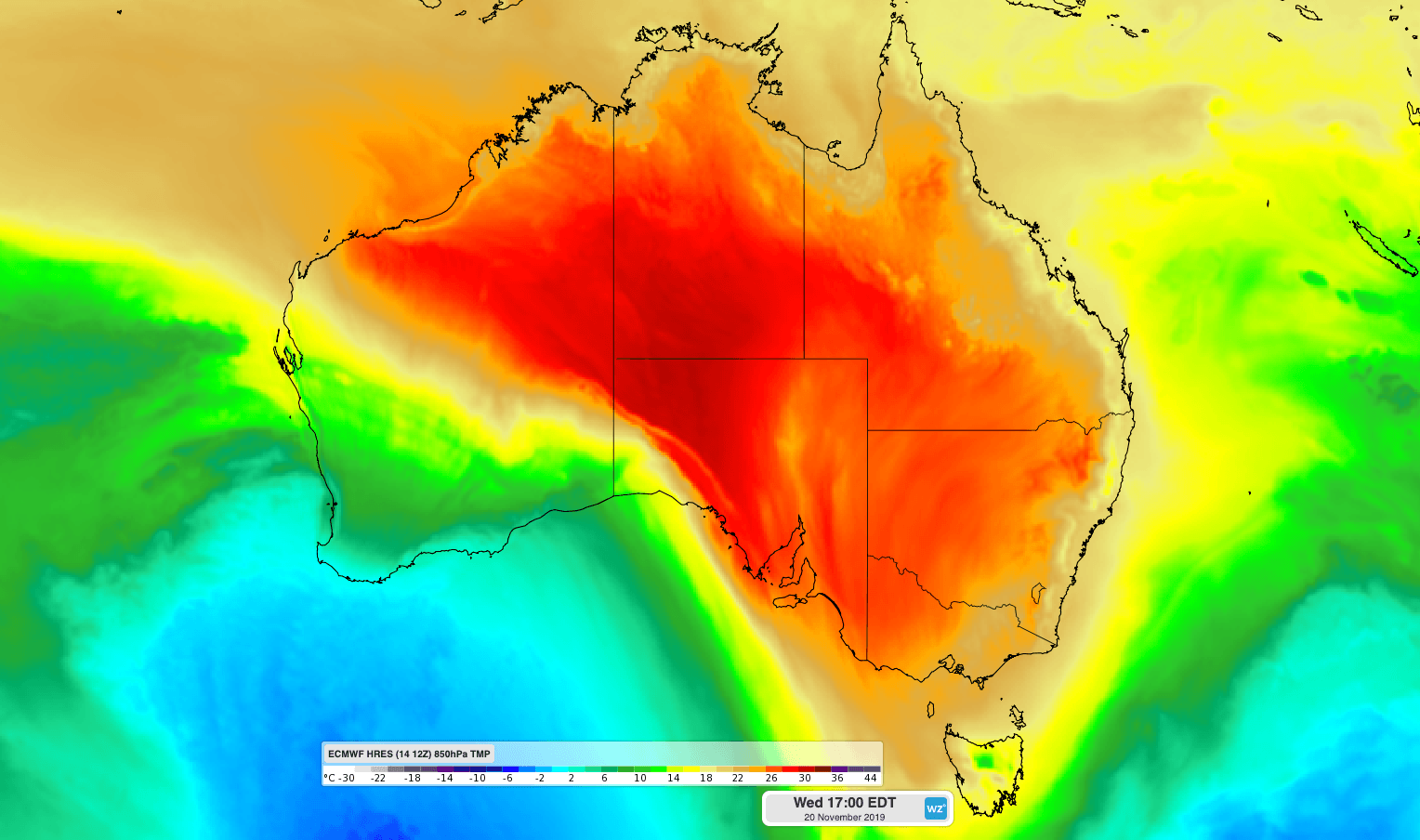 From Tuesday, the hot air mass will start to spread further east as a cold front moves in from the Indian Ocean.