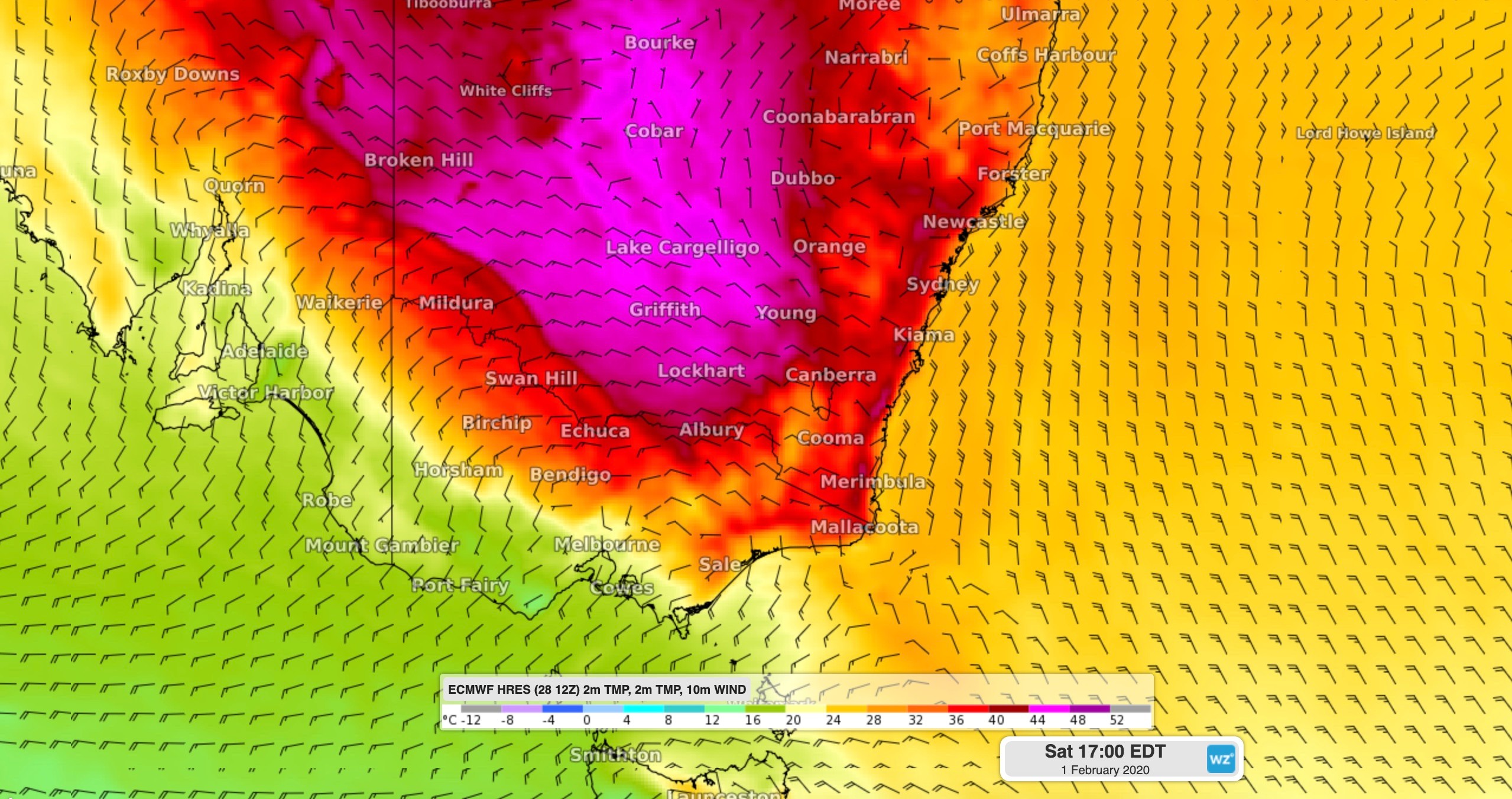 Image: Forecast surface wind and temperature showing hot air being transpotred over southeastern Australia on Saturday.