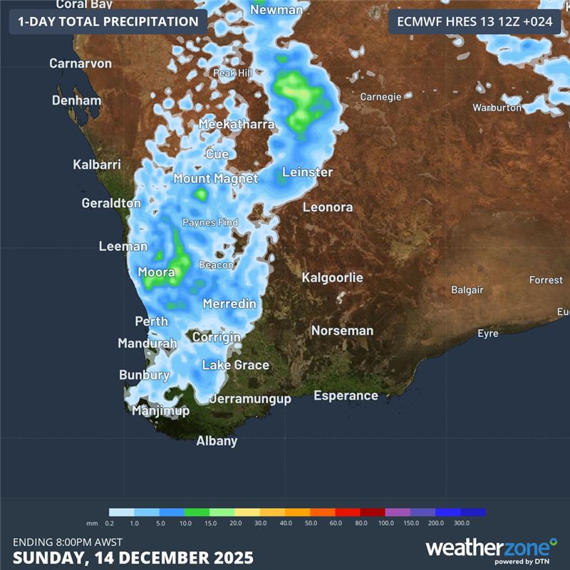 As the trough deepens further through the day, gains moisture and interacts with an upper-level disturbance (a feature higher in the atmosphere that enhances rising air), conditions will become favourable for severe thunderstorms across parts of western WA. For the Perth metropolitan area, severe storms are possible from mid-afternoon into the early to mid-evening, with damaging wind gusts the main threat. Rainfall totals may not be impressive — generally 5–10 mm, with isolated falls up to 15 mm — but after meaningful rainfall has been scarce since October (the last day exceeding 10 mm being 21st October), including virtually no rain so far this December, this would be enough to deliver a small but welcome break in the dry spell.
