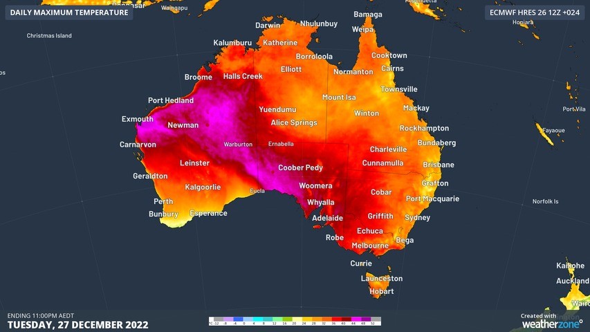The hot night followed a Boxing Day that reached 44.1°C in Nullarbor, the warmest day since November, 2020.