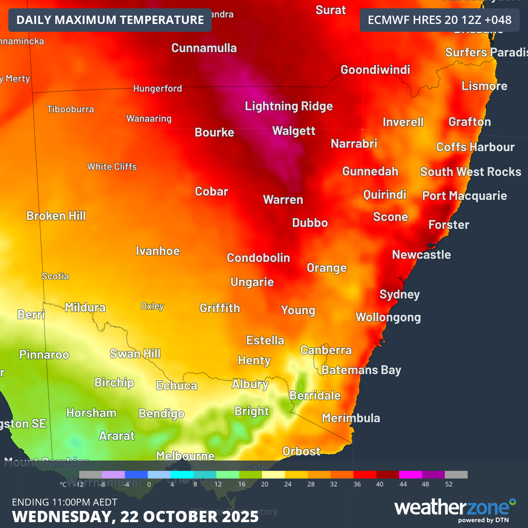 Image: Forecast temperatures for NSW for Wednesday, October 22, according to the ECMWF model. Some coastal areas will be hotter than the NW corner of the state, where heat records were broken on Tuesday.