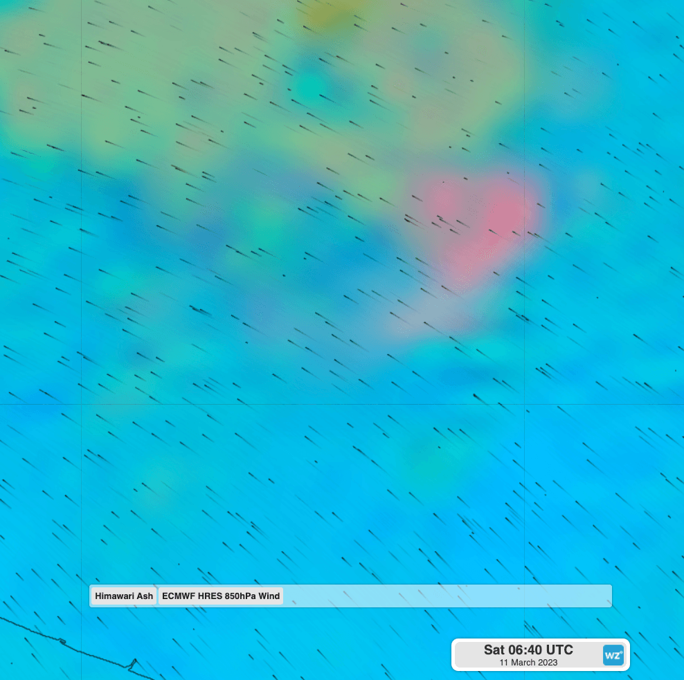 Image: Himawari-9 enhanced satellite and black wind streamlines showing the winds at about 1km elevation spreading the ash cloud to the northwest.