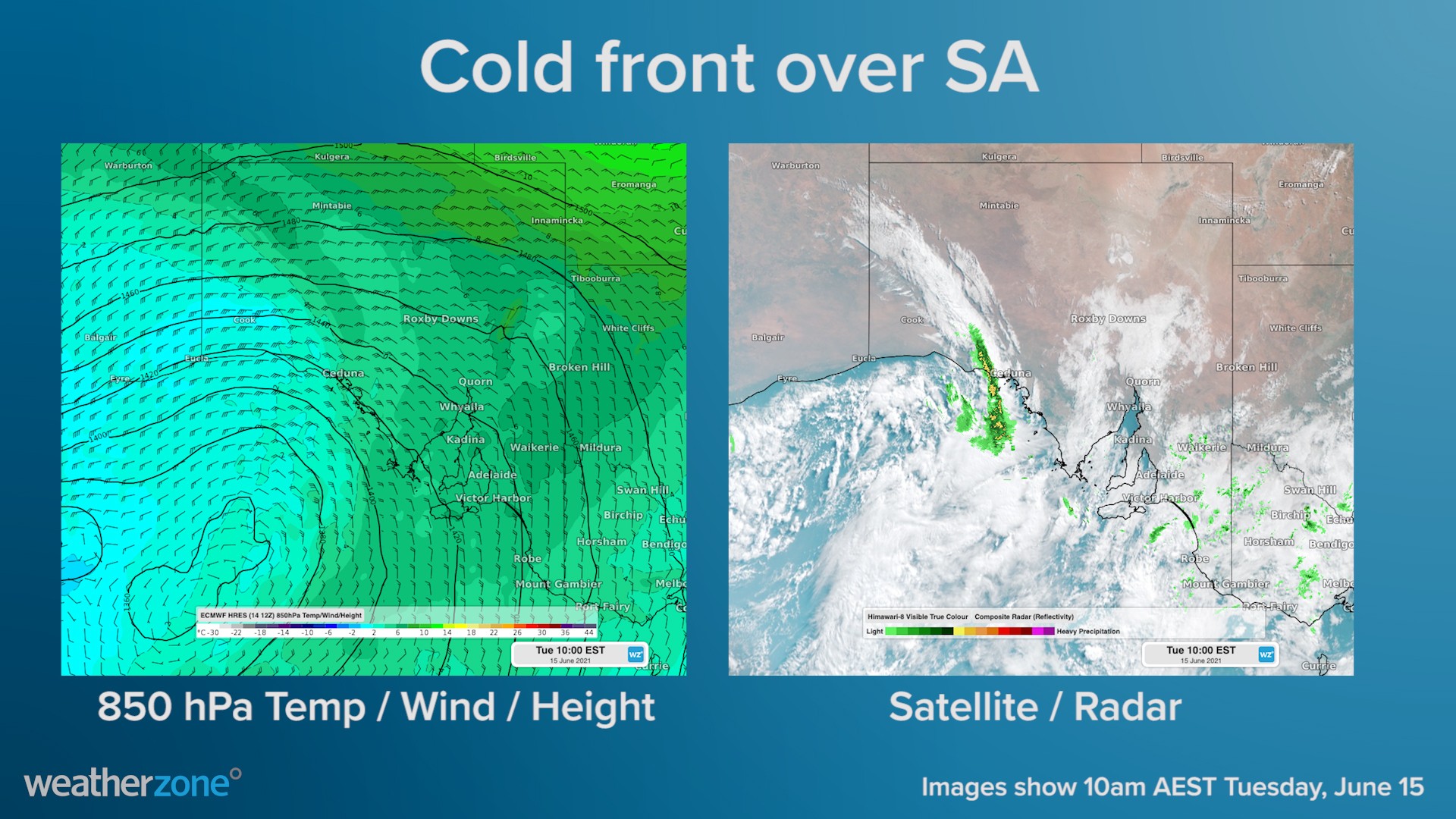 "Some of these showers and storms could affect Adelaide, most likely from the afternoon, before the front reaches the city tonight. The cold air behind the front will bring a noticeable drop in temperature, with Adelaide forecast to reach 18ºC today and only 14ºC tomorrow."