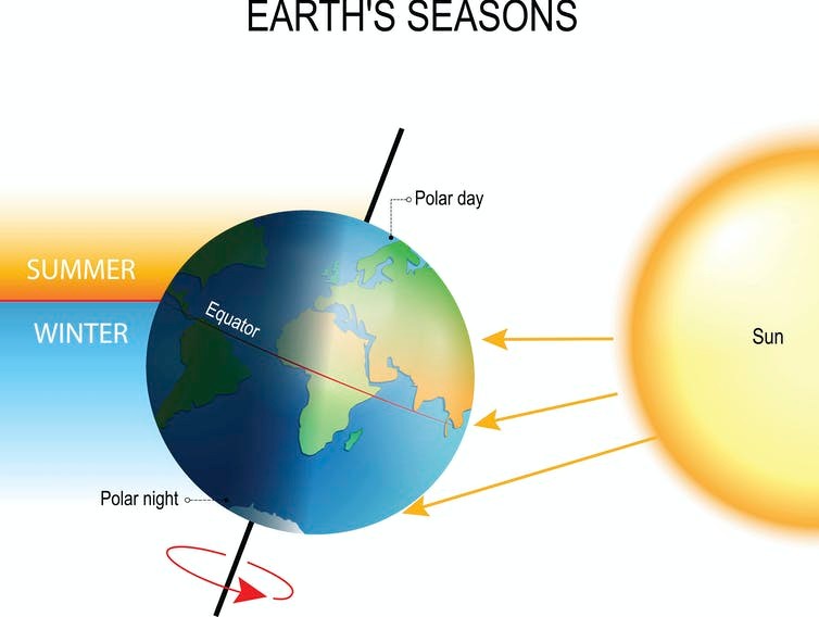 There are two other important factors: First, the Earth is round, although it's not a perfect sphere . Second, its axis is tilted about 23.5 degrees relative to its path around the Sun. As a result, light falls directly on its equator but strikes the North and South poles at angles.