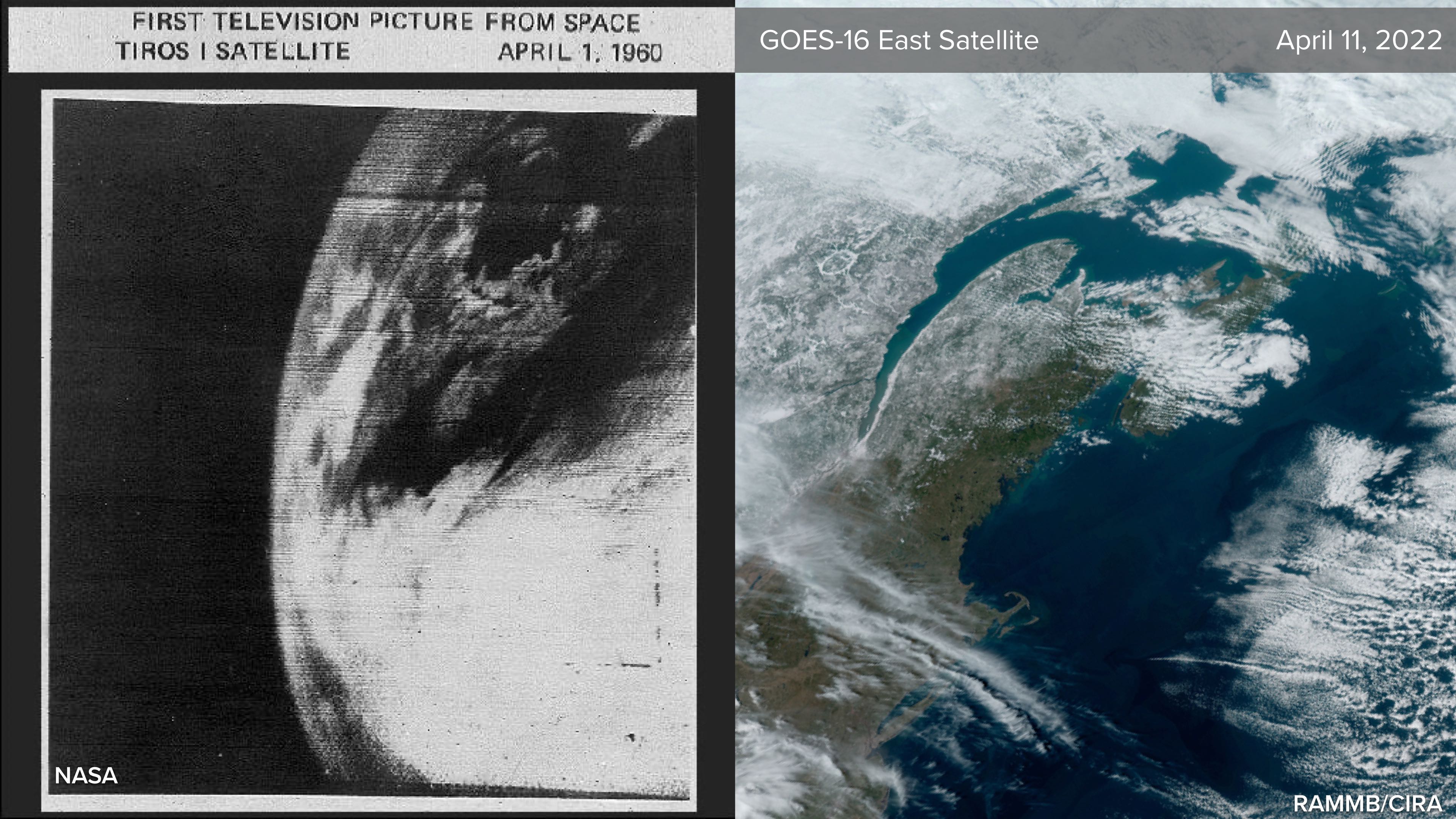 Image: Satellite images of the northeastern United States and eastern Canada captured by the TIROS 1 (left) and GOES-16 East (right) satellites in April 1960 and 2022. Source: NASA and RAMMB/CIRA.