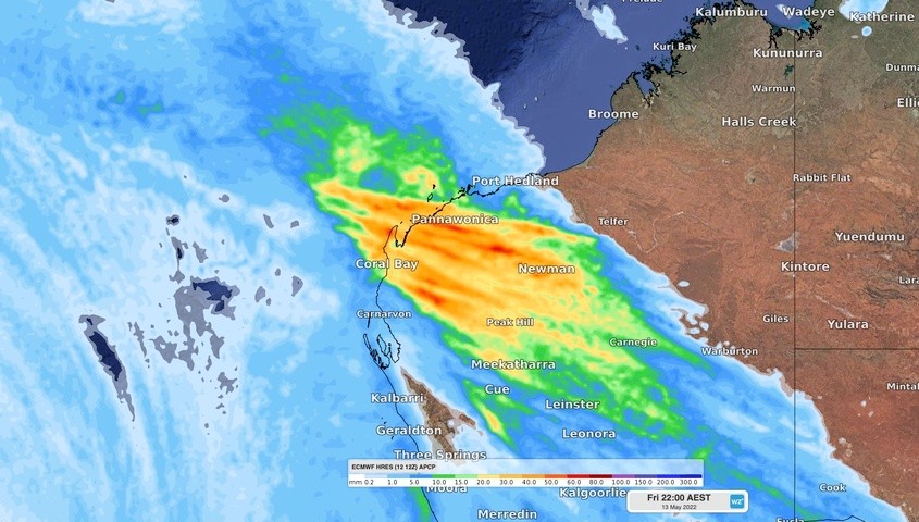 Onslow in the Pilbara saw 49.8 mm of rain in the 24 hours to 9am on Friday, which is roughly equal to the site’s May monthly average and its highest daily total in a year. Nearby, Thevenard Island observed 43.2 mm and Learmonth, to the south of Exmouth, saw 31.6mm in the same period.