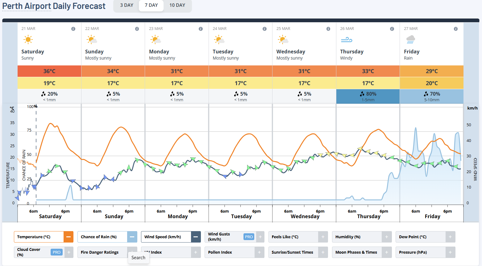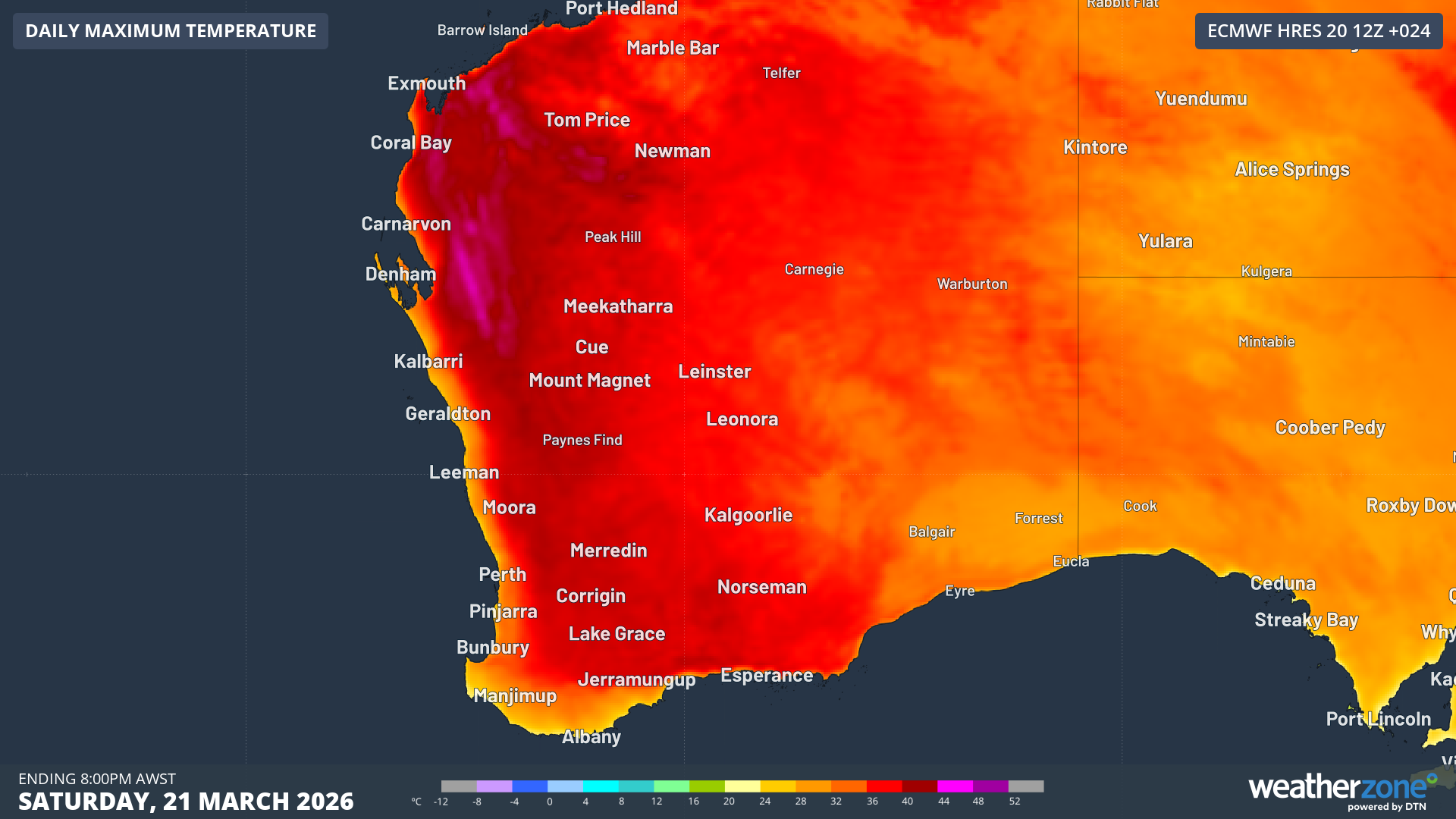 A surface trough extending down WA's west coast to north of Albany, combined with plentiful sunshine has allowed temperatures to rise as much as 7-10°C above the March average through the last few days.