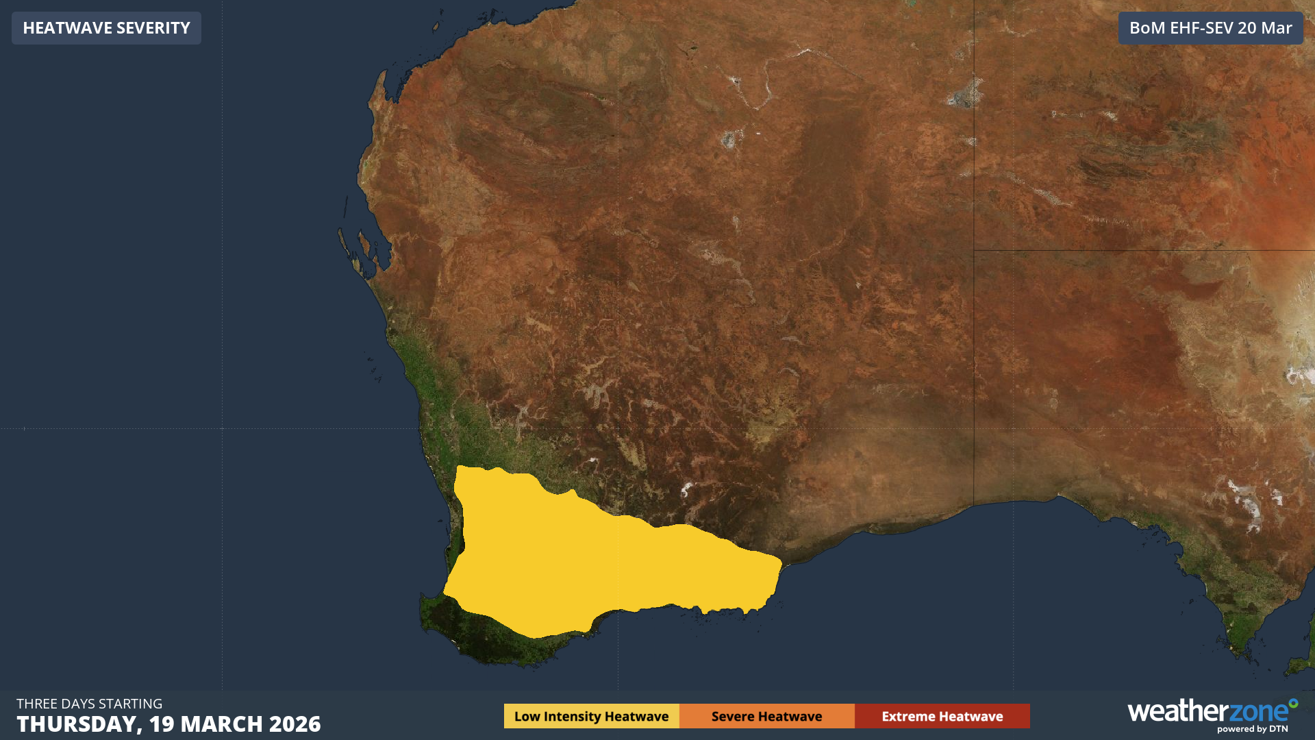 Image: Heatwave severity forecast for the period from Thursday 19th to Saturday 21st. Source: Weatherzone