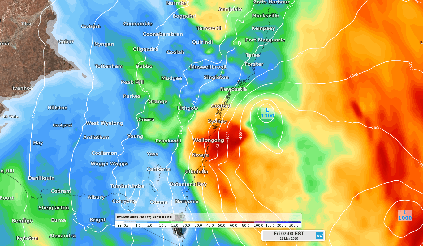 Forecast models suggest that a strong low pressure system will rapidly deepen near the NSW coast during Friday morning. This developing low is likely to cause a burst of heavy rain, powerful winds and large waves along parts of the NSW coast on Friday, particularly during the morning. Some of this weather could become severe.