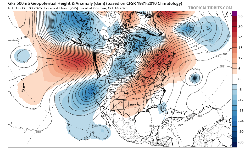 Image: Upper-level forecast from the American GFS model suggests a trough in central Canada during mid-October, which could be a source of some colder air. Source: tropicaltidbits.com